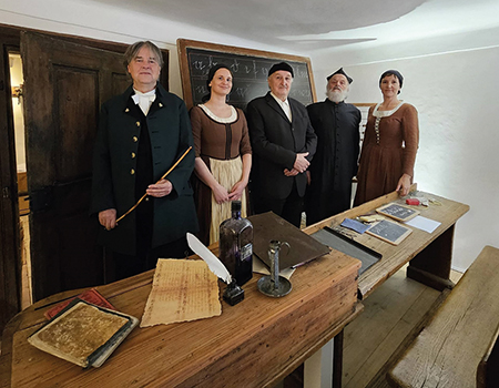 In der Volksschule Arnsdorf – im ersten Stock im Museum – führen sie Mitwirkende des Theaters Holzhausen ein in die Welt von 1818.